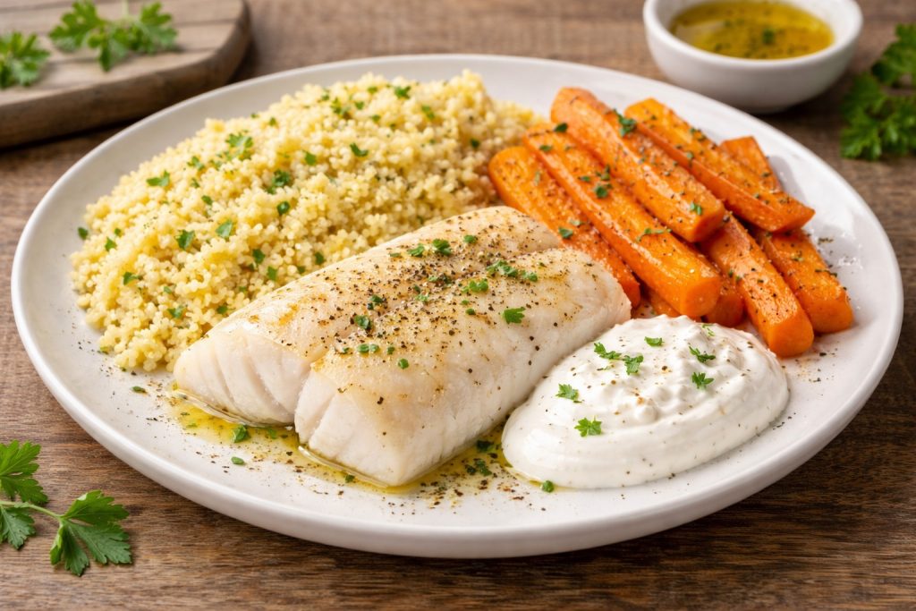 Kaszę jaglaną ugotuj według instrukcji, marchew ugotuj lub upiecz do miękkości. Dorsza skrop oliwą i upiecz w 180°C przez ok. 15–18 minut, a całość podawaj z jogurtem naturalnym.