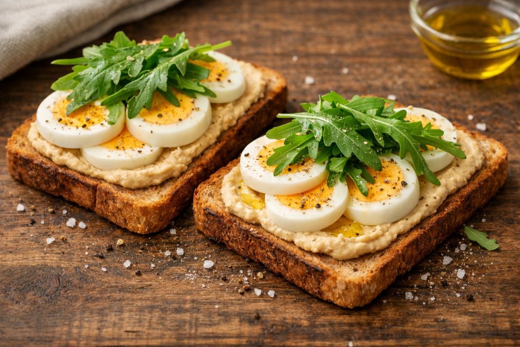 Pieczywo podpiecz w tosterze, jajka ugotuj na twardo lub półtwardo i pokrój w plastry. Tosty posmaruj hummusem, ułóż jajka i dodaj rukolę, skrapiając całość oliwą.