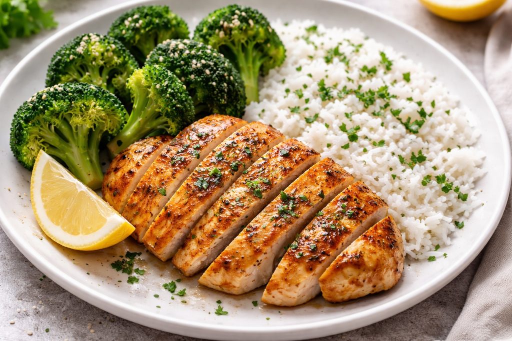 Ugotuj ryż i brokuł, kurczaka upiecz. Podawaj polane jogurtem i przyprawione ulubionymi przyprawami.