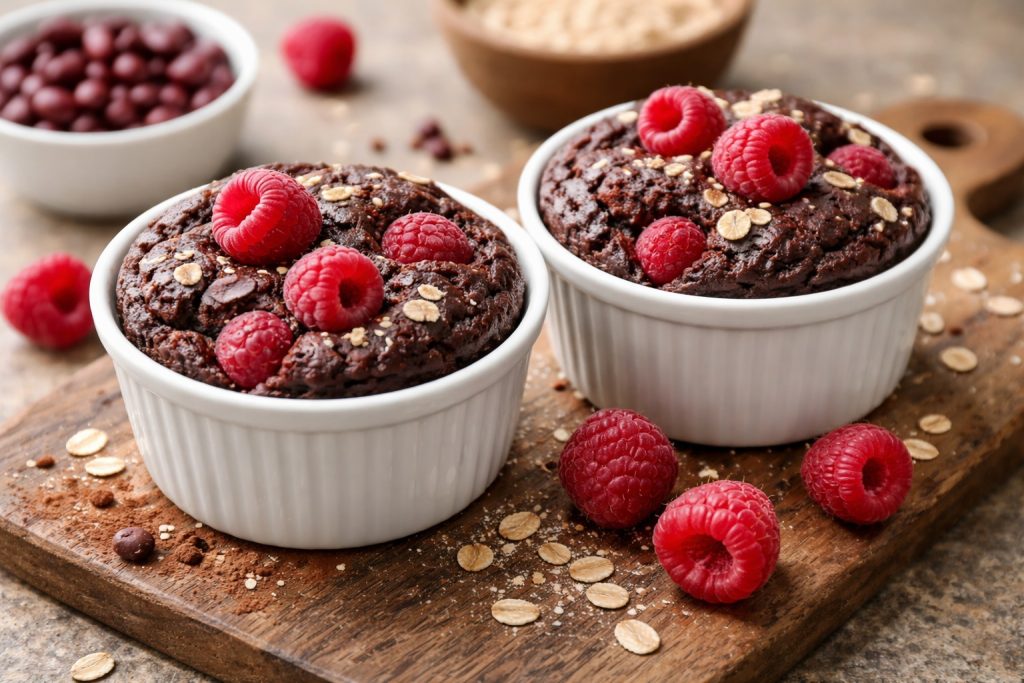 Fasolę dokładnie odsącz i zblenduj z jajkiem, kakao i zmielonymi płatkami na gładką masę. Delikatnie wmieszaj maliny, przełóż do 2 foremek i piecz ok. 25–30 minut w 180°C.