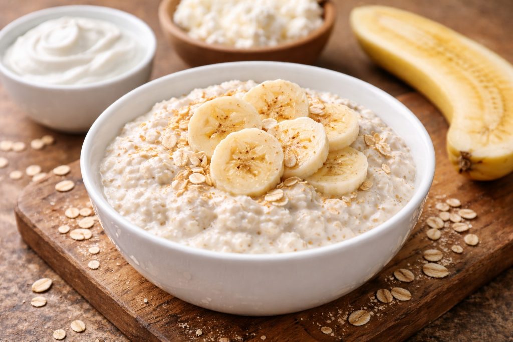 1. Owsianka jogurtowo-twarogowa z bananem (B: 26 g | kcal: 480)