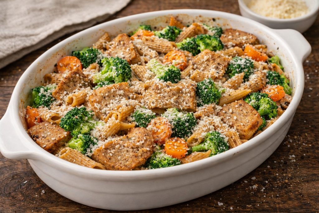 Makaron ugotuj al dente, seitan pokrój w plastry i wymieszaj z warzywami. Przełóż do naczynia, posyp parmezanem i zapiekaj 20–25 minut w 190°C.